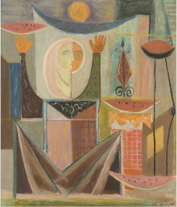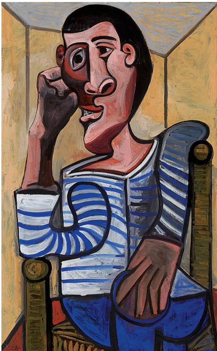 Placed against two jagged lines, Picasso’s painting of a white human head and a vase filled with leaves is estimated